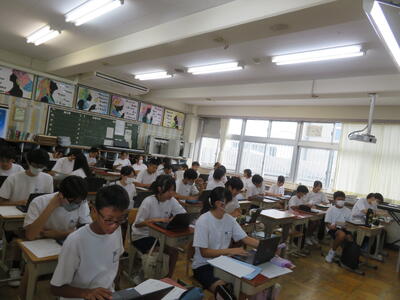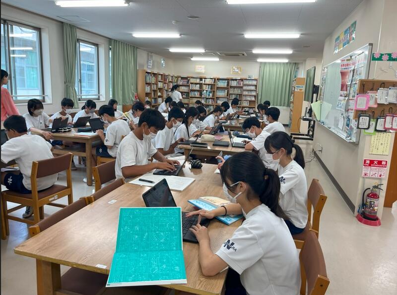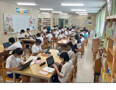夏休みが明けて、前期の期末テストが明日に迫っています。テスト勉強に取り組みながら、2年生の国語「夢を跳ぶ」では、図書館の資料とインターネットの情報を使いながらレポートを作成しています。テーマは各自で設定します。ただ検索をするのではなく、自分で見つけた疑問を解決するために必要な情報を集めることをポイントにして活動しました。探した情報は引用のルールにしたがってレポートに使います。これからの調べ学習にも活用してほしいです!