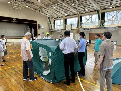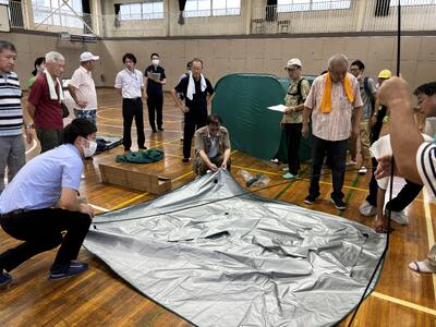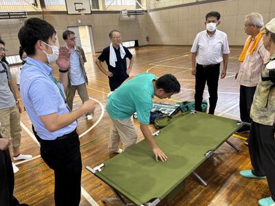 今回は、増尾近隣センター所長松井様、防災安全課西山様、増田様、生活支援課杉田様(災害時に避難所に駆けつける市の職員の方)にもご来校いただき、訓練内容の事前確認後、避難所備品の確認、受付の設営訓練、避難場所の設営訓練(テント、簡易ベッドの組み立て等)を行いました。