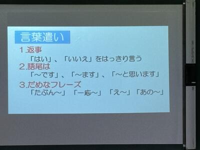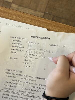 また、面接時の注意事項、言葉遣いなども説明がありました。言葉遣いでは普段使用している「お父さん、お母さん」をどう言い換えるかや、志望校の呼び方などの話がありました。
