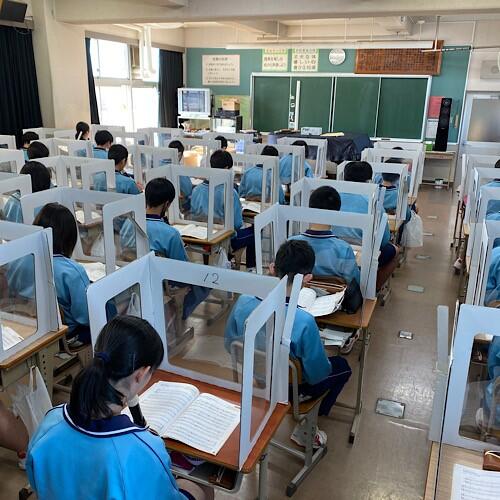 3年生の音楽ではアルトリコーダーを練習しています。感染予防対策として各席を簡易パーテーションで仕切っています。ヴィヴァルディの「四季」より「春」を演奏していました。さすが3年生という感じでした。