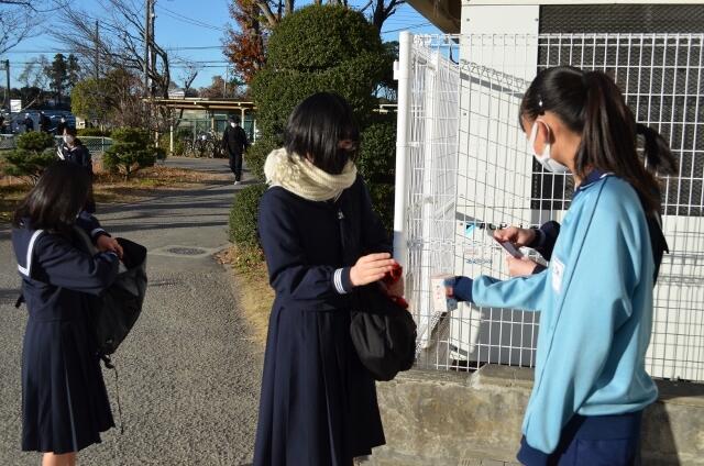 生徒会役員のみなさんが、赤い羽根募金の活動をしています。たくさんの生徒や先生方が協力をしてくれています。