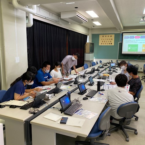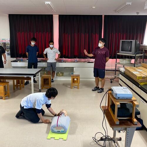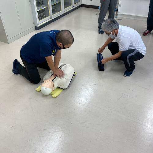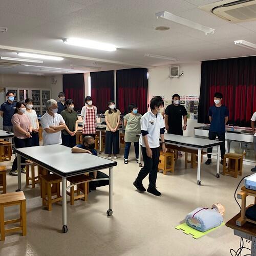 今日は職員会議の後、教職員で救命救急の講習会を実施しました。人形を使っての胸骨圧迫とAEDの使用をシミュレーションして行いました。体育科の先生が見本を見せた後、グループに分かれて全員が胸骨圧迫を行いました。