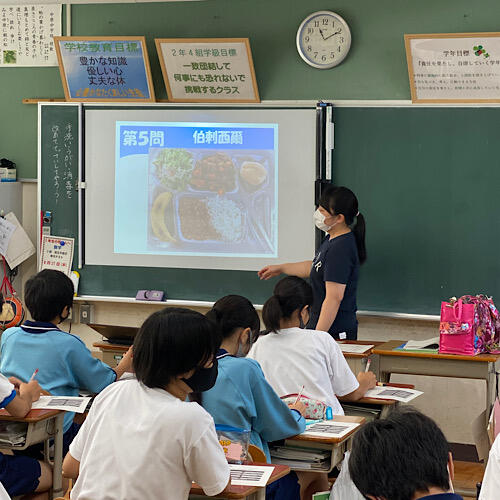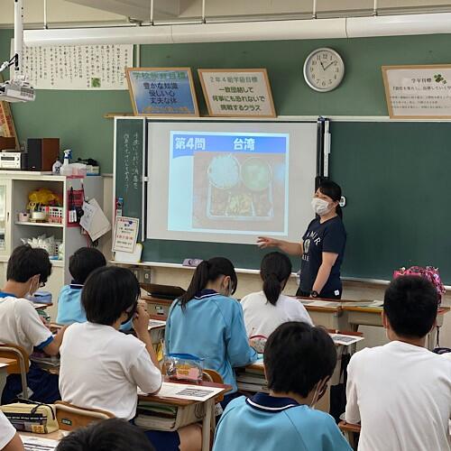 2年生の家庭科の授業で、世界各国の給食を当てるクイズをやっていました。それぞれの国で特色があり、盛り上がりました。