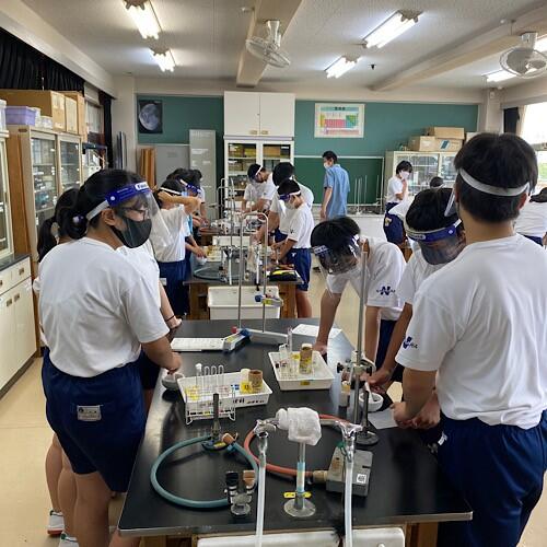 2年生の理科室での実験の様子。フェイスシールドで感染防止対策です。