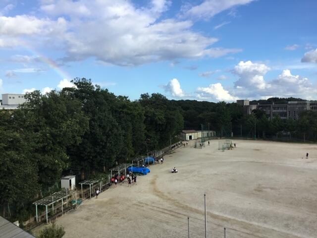 現在進行中の「中原レインボープロジェクト」ですが、パンフレット制作に向けて、美術部の3年生が写真を選択したり、撮影したりしてくれています。そのうちの一枚がこれ。校舎から虹が見えているのがわかるでしょうか。素敵な一枚です。