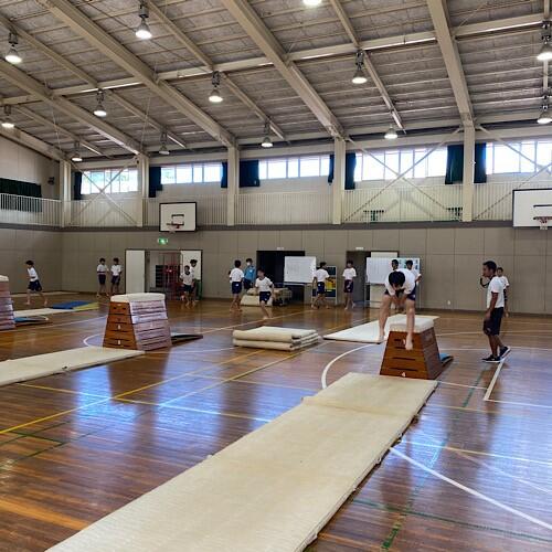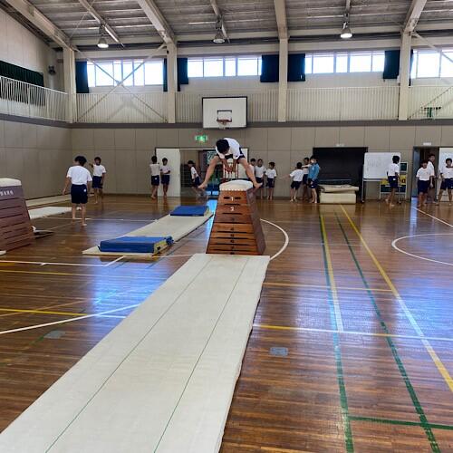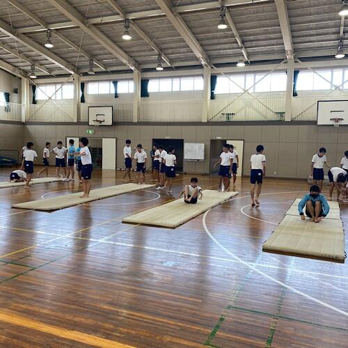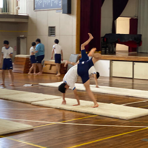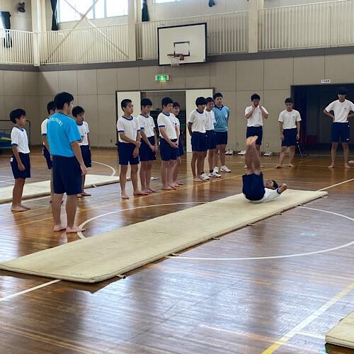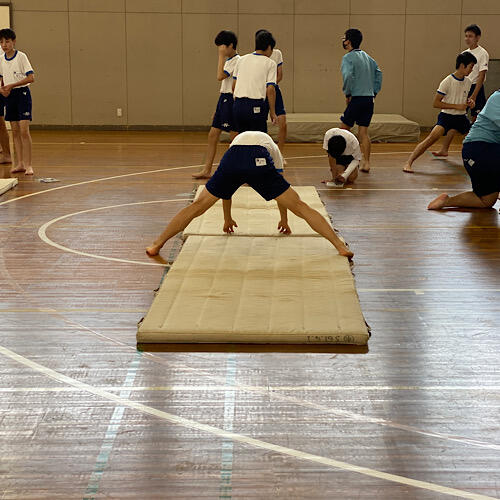 3年生男子の体育の授業ではマット運動に取り組んでいました。積極的に技の習得に取り組んでいます。