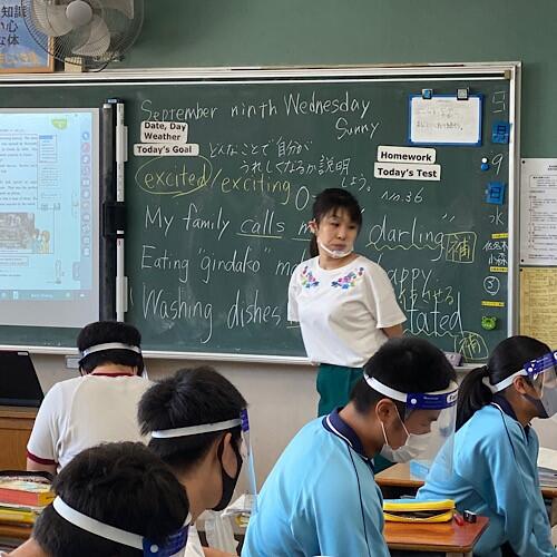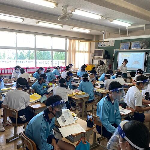 3年生の英語では、「どんなことで自分がうれしくなるか説明しよう!」というテーマで近くの生徒とコミュニ―ケーションの練習です。対面の会話なのでフェイスシールドをつけて行いました。