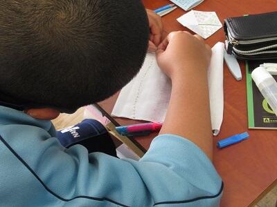 針に糸を通す際に「糸が言うことを聞いてくれないー!」と言っている生徒がいたり、「玉止めができない・・・」と言っている生徒もいましたが、お互いに教えあいながら活動できました。
