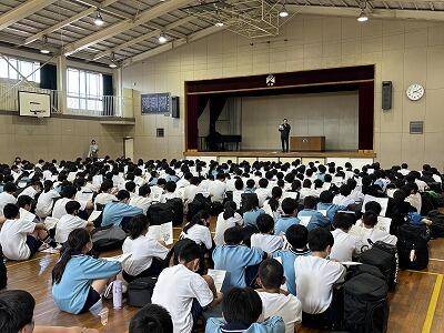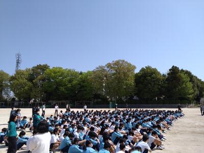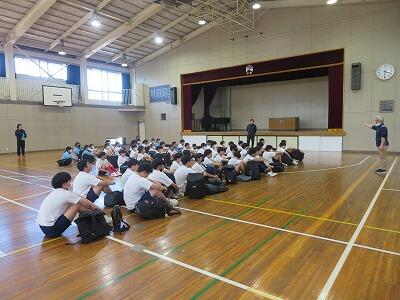 全校生徒が体育館に集まり、新入生オリエンテーションが行われました。
