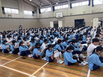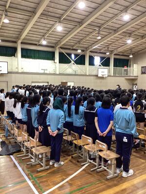1年生はこの1週間、朝の会の前に3年生の先輩たちから校歌指導を受けてきて、この本番では1週間の積み重ねを発表しました。元気に1番を歌いきりました!