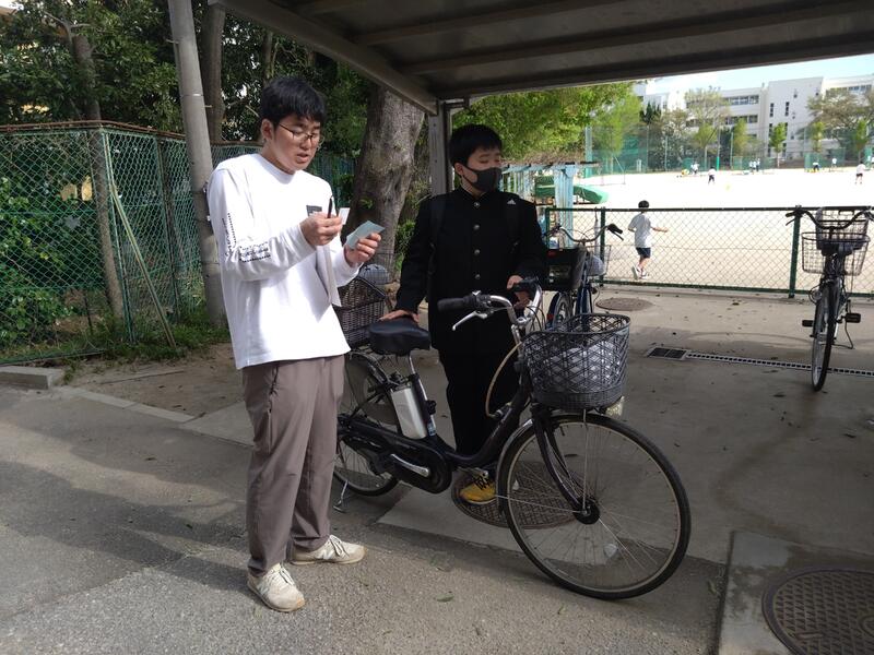 集会後は駐輪場で自転車の点検を行い、自転車の不備がないか生徒同士で確認しました。
