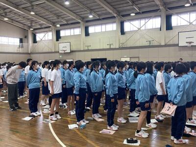4月25日(木),本日放課後,体育館にて部活動発足式を行いました。1年生が仮入部期間を終え正式入部となり,各部ごとに全員が集まりました。全体会では,部活動担当の安藤先生から,部活動についての心構えや中原中でのルールなどについて,お話がありました。