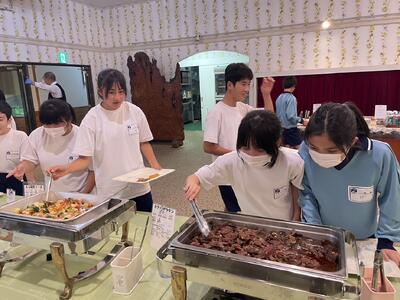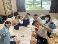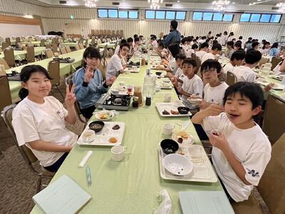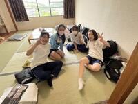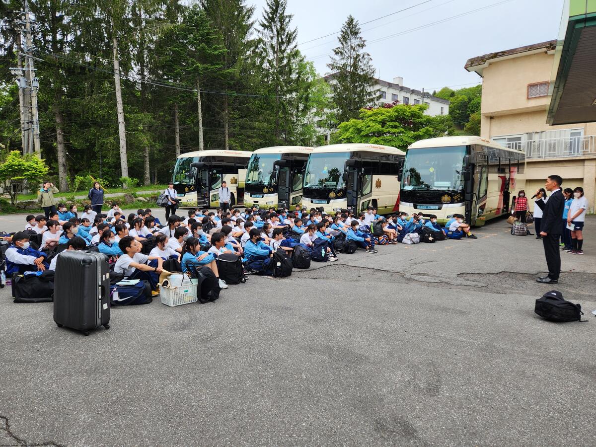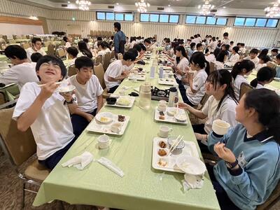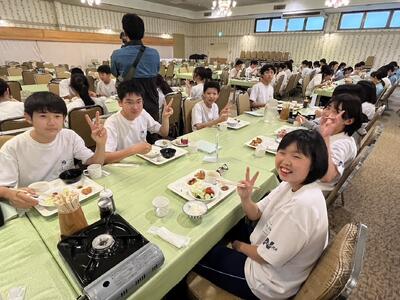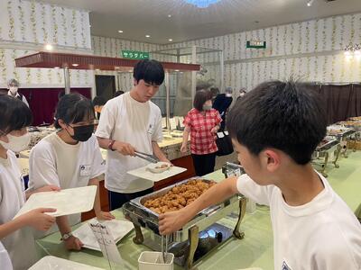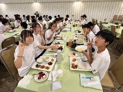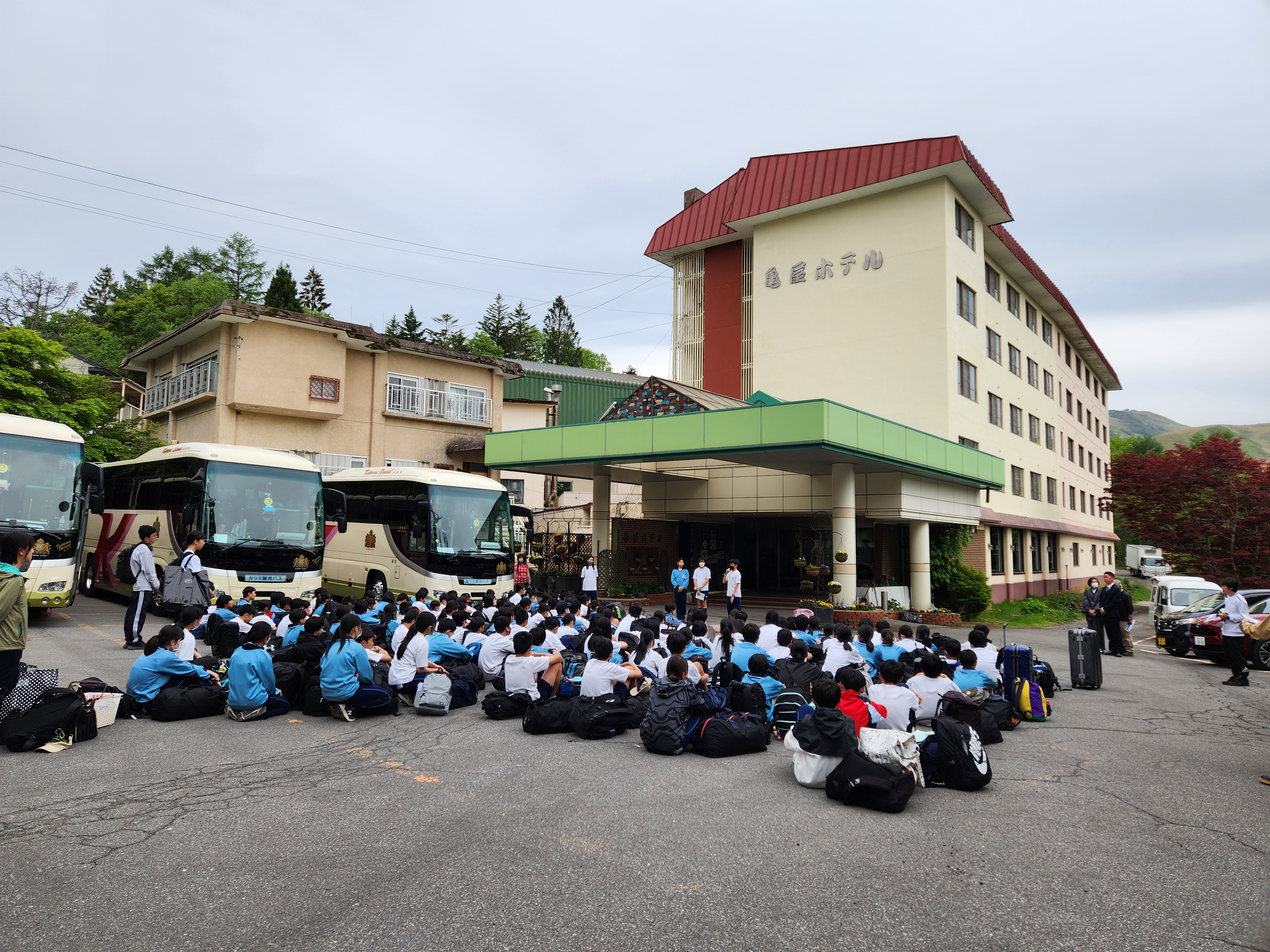 宿舎の亀屋ホテルに到着しました。ホテル前で開校式を行い、各部屋に入ります。少し休憩後、バイキング形式の夕食となります。