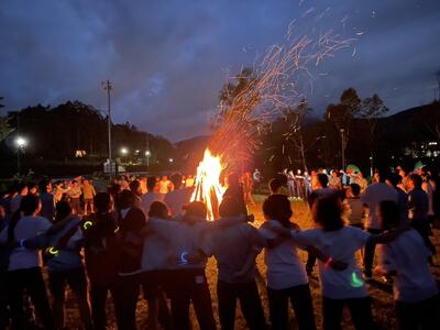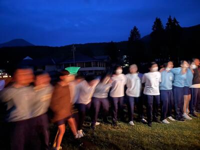 夕食を終え、子供たちはキャンプファイヤー場に移動しました。いよいよ始まりです。フォークダンスで楽しんでいます。
