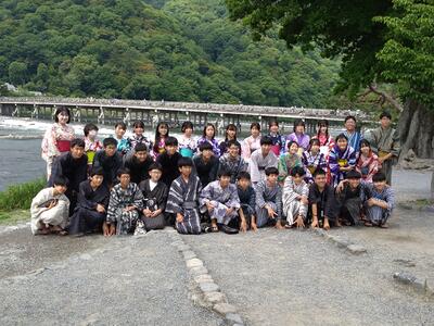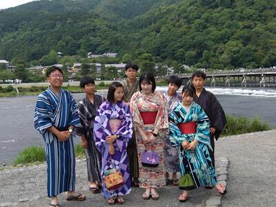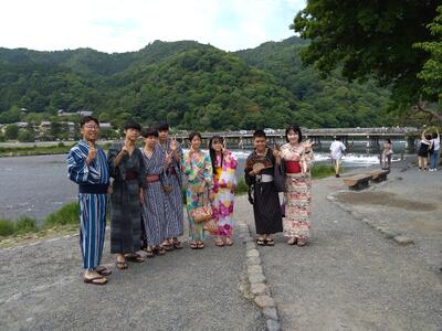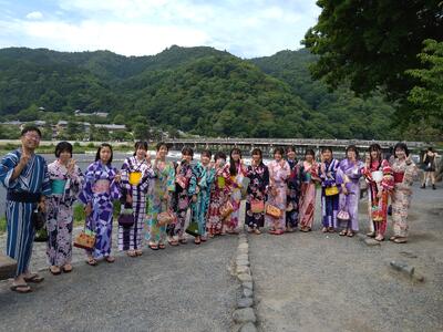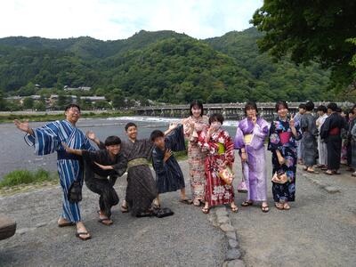 宿舎で着替えをして、バスで渡月橋まで向かいました。担任の井上先生も率先して着付けをしました。また、男性の先生も…とのことで沖田先生も着付け体験に参加しました。