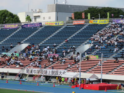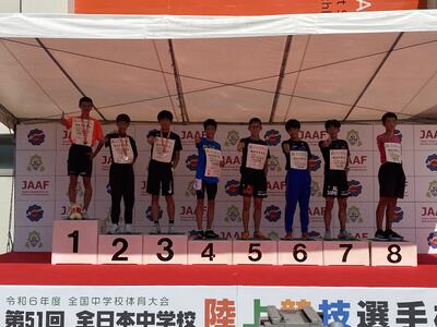 8月7日に関東中学校陸上競技大会で男子共通800mで予選を通過した3年の木南君が8日の決勝に出場し,見事に2着でゴールしました。タイムは,1分55秒17,木南君を含めこの日の3位までが大会新記録となりました。次は,17日から福井県で開催される全国大会への出場です。素晴らしい走りを期待したいですね。