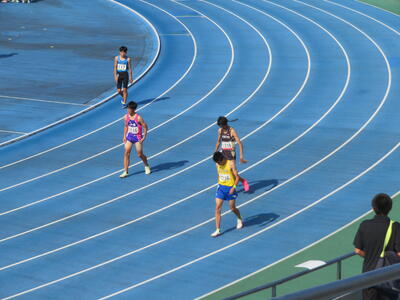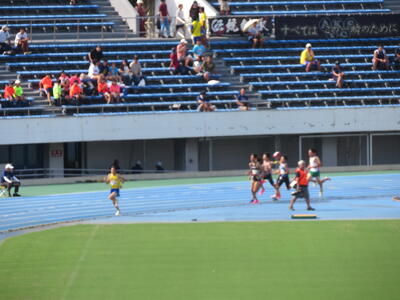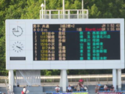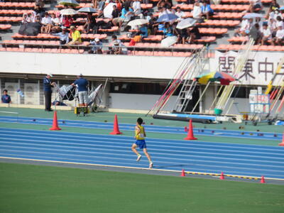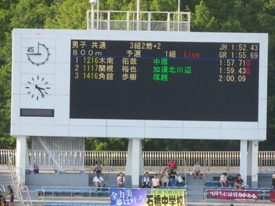 8月7,8日に東京・駒沢オリンピック公園陸上競技場を会場に関東中学校陸上競技大会が開催されています。本校より3年の木南君が男子共通800mに出場します。7日,午後3時過ぎに予選が行われ,木南君は第1組で出場しました。スタート直後から順調な走りで終始リードし,堂々の1着でゴールしました。タイムは,1分57秒71。着順により,明日の決勝進出を決めました。決勝でも力いっぱいの走りを期待しています。がんばれ!!