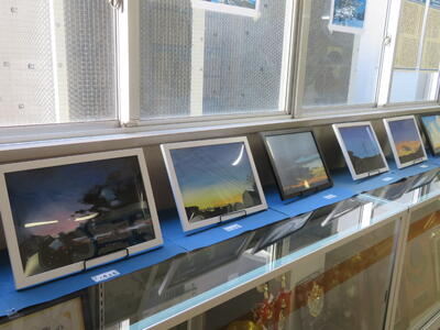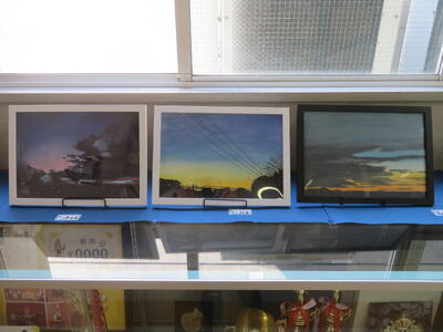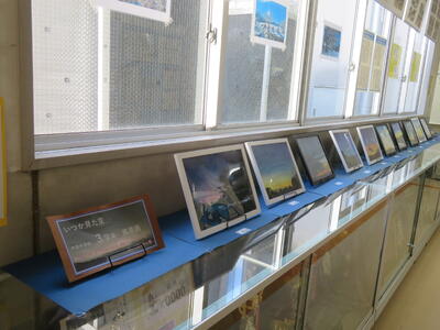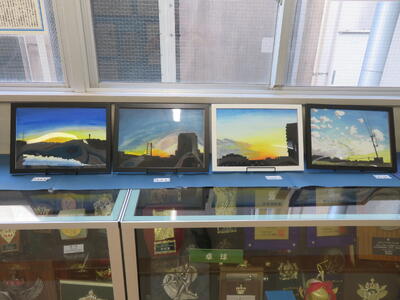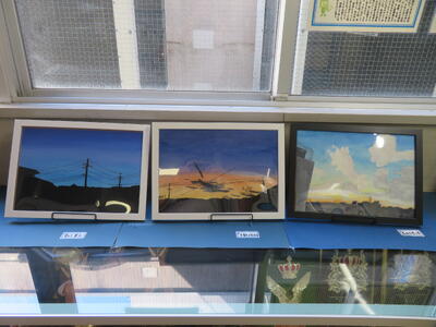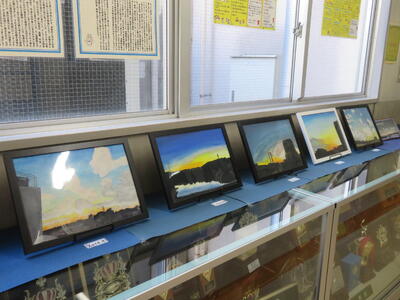 職員室前廊下のショーケースの上に,生徒の美術科の作品が飾られています。3年生が授業で制作した風景画「いつか見た空」にリニューアルされ,その第2弾です。今月は,3組の作品です。どの作品もすばらしい出来映えです。来月は2組,11月は1組の予定です。来校の際は,ぜひご覧ください。