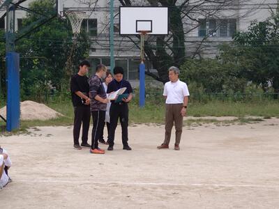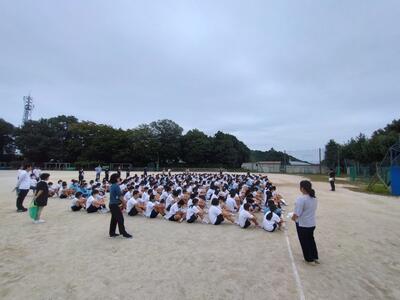 グラウンドに集合し点呼した後、安全担当の数藤先生から避難時の様子について、教頭先生から避難後のその後の動きについてお話がありました。