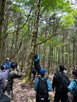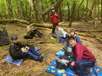 風穴駐車場から樹海散策コースに出発しました。天気も大きく崩れることもなく、氷穴に着く頃には晴れ間ものぞいていました。各クラスを2グループに分け、インストラクターに付いてもらい説明を聞きながら案内してもらいました。