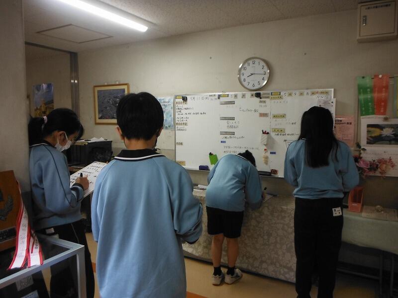 8時10分にはホワイトボード係の生徒は職員室前の廊下でこのように連絡事項をクラスのために確認します。