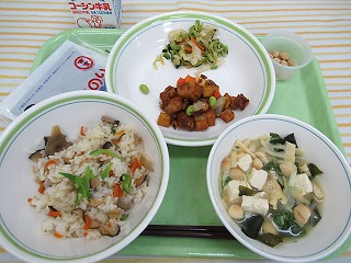 皆さんがどんな勝負にも勝てるよう「勝つ男」の語呂(ごろ)合わせに、繁栄(はんえい)と長寿(ちょうじゅ)にかけて「カツオの五色揚げ煮)」、すくすく育つよう願いを込めて「筍の味噌汁」にしてみました!