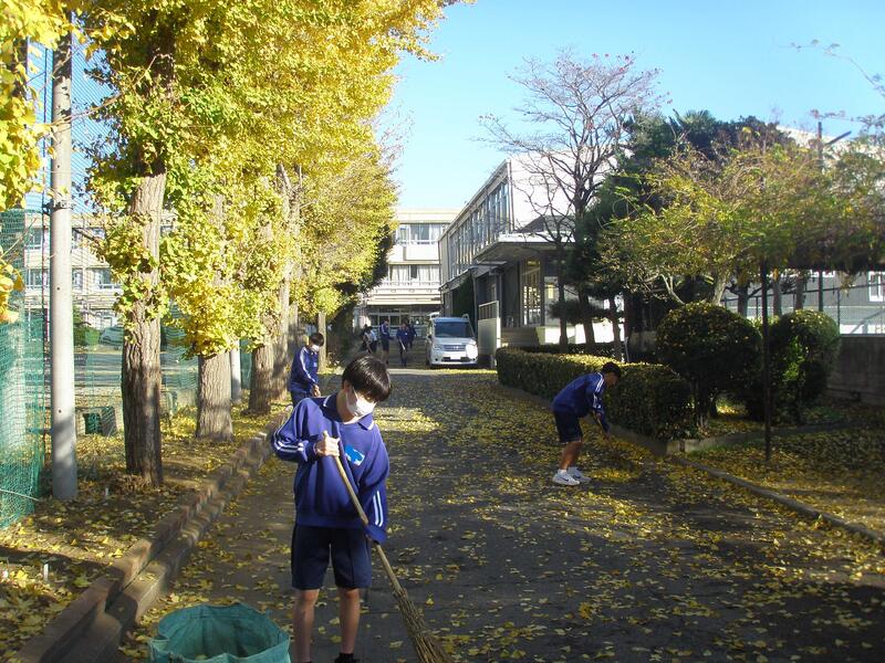 いつもは用務員や教頭で行っていた落ち葉掃きですが,