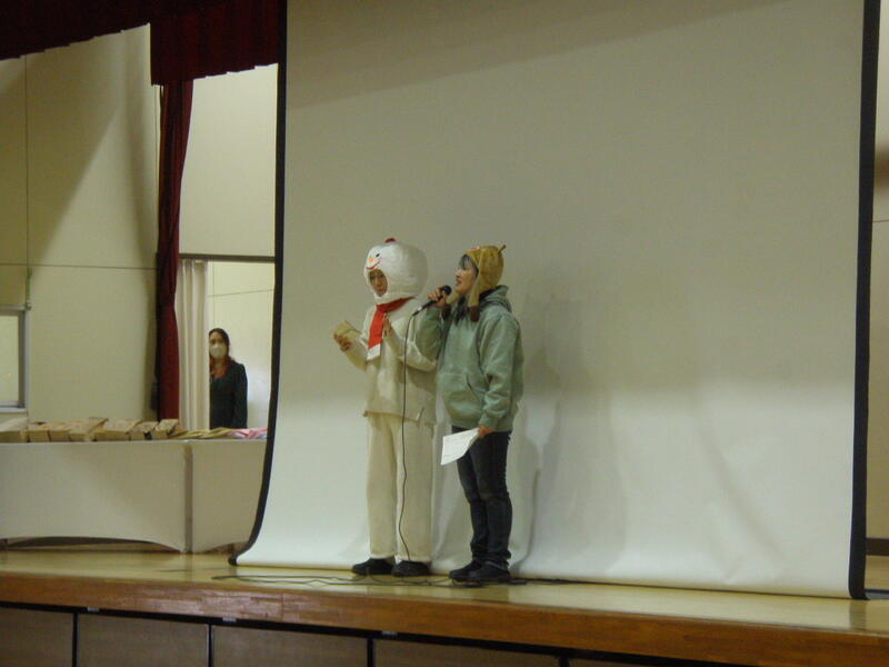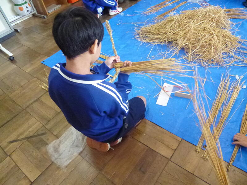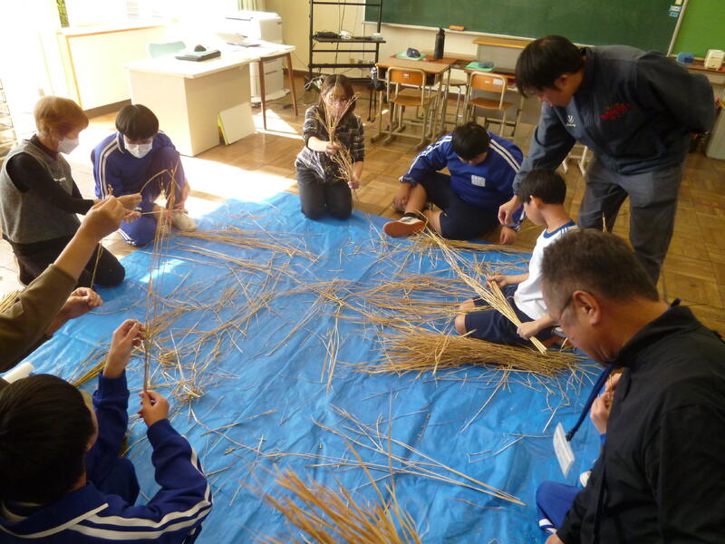地域の方々の協力を得て,わらを使って正月の飾りを作りました。