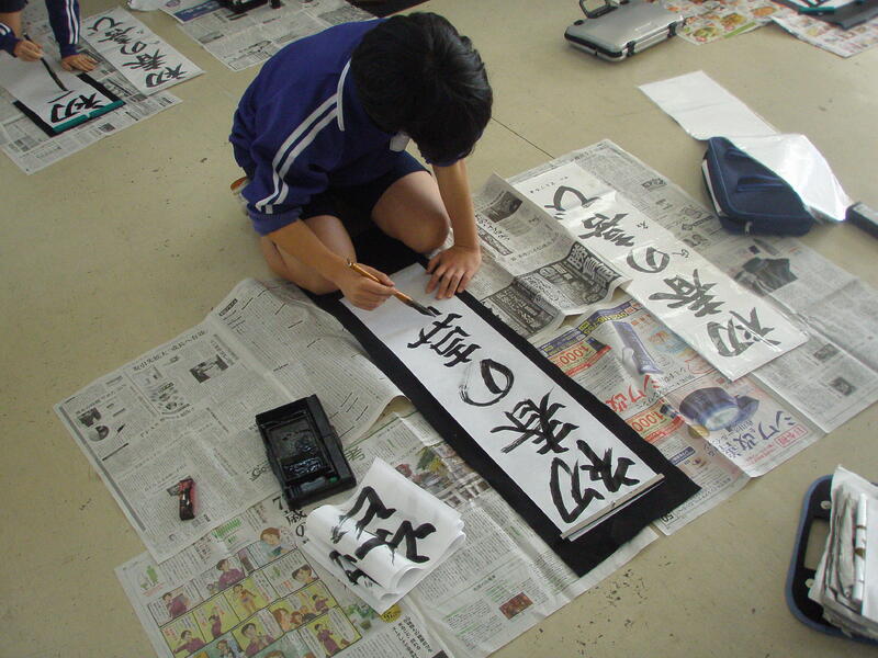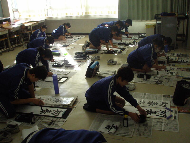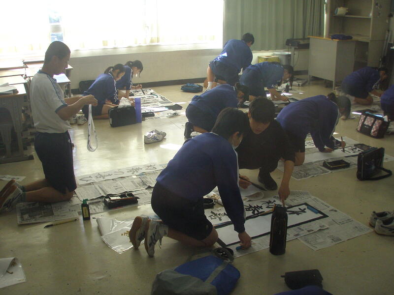 床に新聞紙を引いて,黙々と字と向き合っていました。