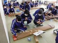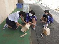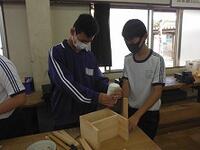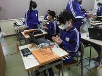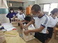3校時の1年1組の技術では,木材加工を利用した中で自分で考えて1枚の板から木工作品を製作します。CDラックや本立て,調味料入れなどそれぞれの作品作りに取り組んでいました。仕上げの段階で,紙やすりで磨いている人,トンカチで釘を打って接合している人などいましたが,どんな作品が仕上がるか楽しみですね。
