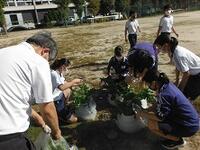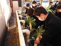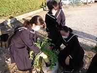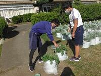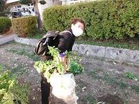 本日は,3年1組が追肥をしたり水やりの作業をしながら,自分のダイコンの成長を確かめていました。