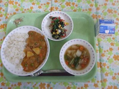 牛乳・ドライカレー・キャベツとしめじのサラダ・ポテトスープ・小魚