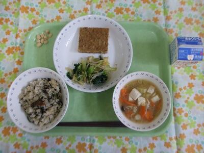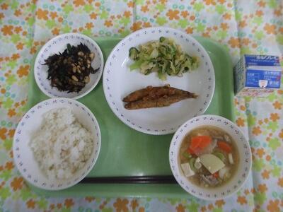 牛乳・ひじき御飯・鰯のさんが焼き・ごま和え・さつま汁・きな粉大豆
