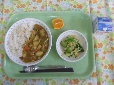 牛乳・葱とかぶのカレーライス・海藻サラダ・いよかん