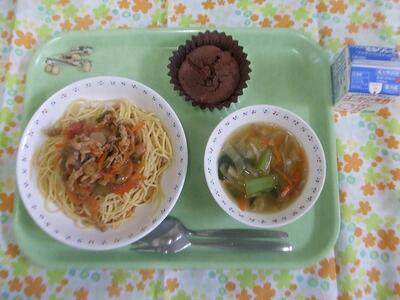 牛乳・トマトときのこのスパゲティ・千切り野菜のスープ・チョコマフィン