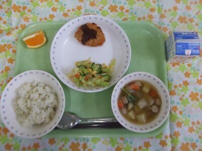 牛乳・ご飯・アジフライ・辛子和え・五目豆・どさんこ汁