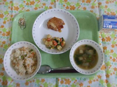 牛乳・ご飯・ししゃもの香味ソースがけ・胡麻酢和え・大豆の磯煮・豚汁