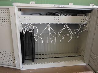 各教室の後方にタブレットの充電ができる保管庫が設置され,夜間に充電すれば翌日に一日使っても大丈夫なようになっています。