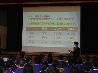 5校時は,1・2年生を対象に柏市教育委員会少年補導センターの村松恵治指導主事を講師としてお招きして,「情報モラル~ネットトラブルを防ごう~」のタイトルで講演していただきました。様々なトラブル事例を聞きながら,スマホやインターネットの使い方を考えるきっかけになったと思います。ご家庭でも,是非お子様と話をしてみてください。