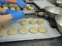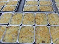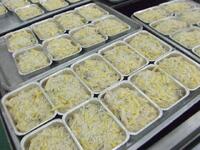 鶏ひき肉、豚ひき肉、たまねぎ、にんじん、高野豆腐、卵をよく混ぜ合わせ、天板に広げて上に白ごまをふりかけ、オーブンで焼きました。焼き上がったら、四角くカットして食缶に盛り付けます。