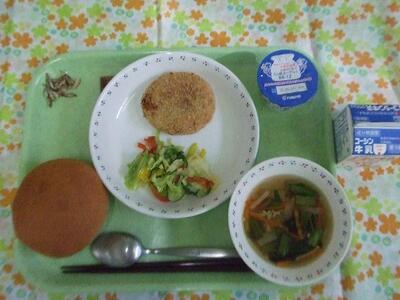 牛乳・丸パン・いんげん豆のコロッケ・フレンチサラダ・ABCスープ・ヨーグルト・アーモンド小魚