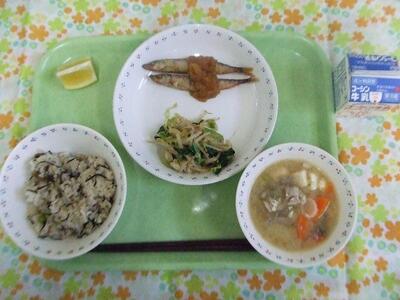 牛乳・ひじき御飯・鰯のさんが焼き・ごま和え・さつま汁・メープルカシューナッツ