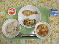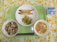 牛乳・ひじき御飯・ししゃものパリパリ揚げ・キャベツのごま酢和え・味噌けんちん汁・きな粉大豆