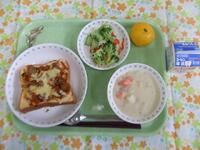 牛乳・ピザトースト・ブロッコリーサラダ・鶏肉のクリーム煮・みかん・アーモンド小魚