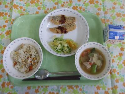 牛乳・チキンピラフ・カマスのフライ・はちみつドレッシングサラダ・ポトフ