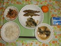 牛乳・ご飯・ししゃもの磯辺揚げ・アーモンド和え・五目豆・大根の味噌汁・みかん