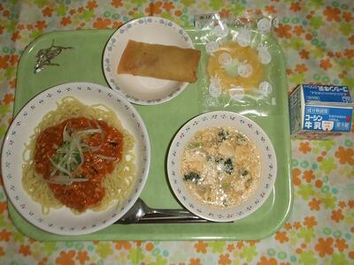 牛乳・ジャージャー麺・ポテトとチーズの春巻き・中華たまごスープ・冷凍パイン・小魚