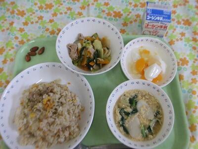 五目炒飯・いかと野菜の炒め物・トック入り卵スープ・杏仁豆腐・炒りアーモンド
