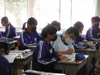 期末テストでは、1日目に社会、国語、英語。2日目に理科、数学、保体になっています。真剣な表情でテストに