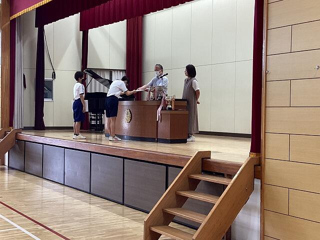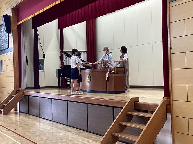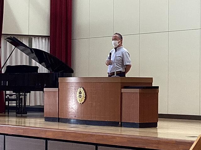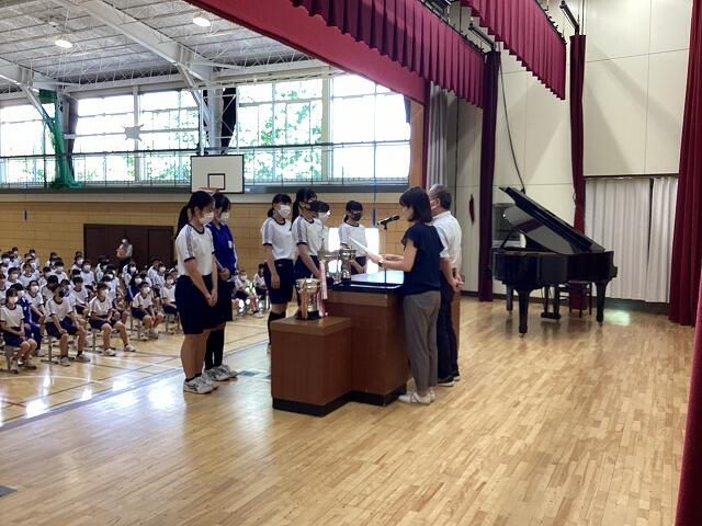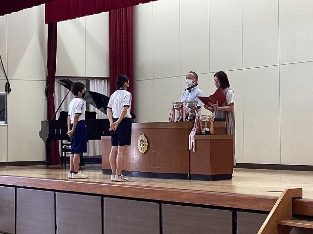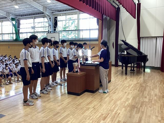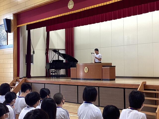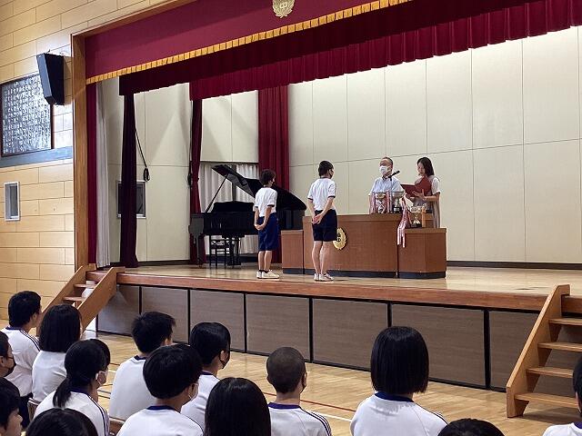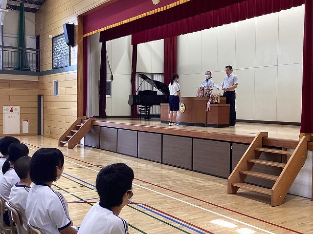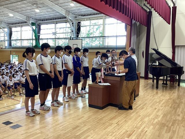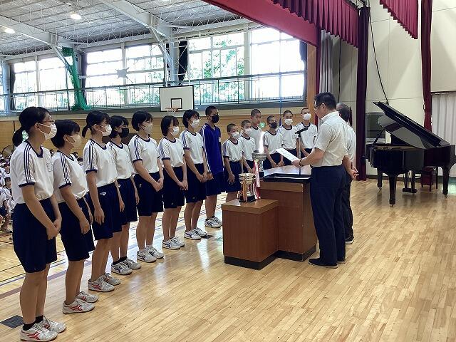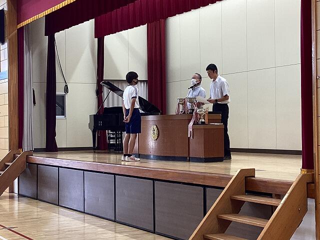 表彰が行われました。生徒たちは堂々とした姿で立派でした。これから総合体育大会をむかえる部活もあります。入賞目指してがんばってきてください。